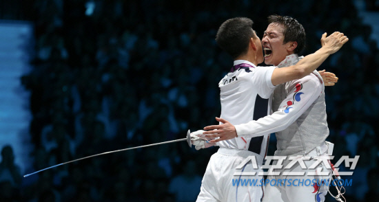 한국 펜싱 국가대표 최병철이 31일 저녁(현지시각) 런던 엑셀 런던 사우스 홀에서 열린 남자 펜싱 플뢰레 개인전 동메달 결정전에서 이탈리아의 안드레아 발디니에게 승리한 뒤 이정현 코치와 함께 환호하고 있다.