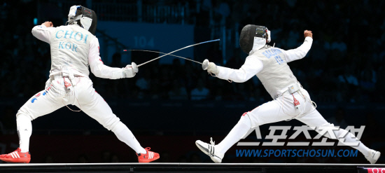 한국 펜싱 국가대표 최병철(왼쪽)이 31일 저녁(현지시각) 런던 엑셀 런던 사우스 홀에서 열린 남자 펜싱 플뢰레 개인전 동메달 결정전에서 이탈리아의 안드레아 발디니를 상대로 선전하고 있다. 최병철이 동메달을 차지했다.