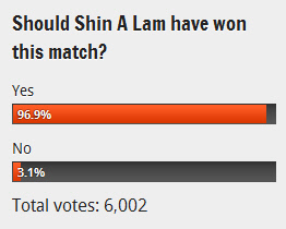 이 매체는 기사 페이지에 '신아람이 이 경기에서 이겨야했나요?'란 설문을 실시했다. 하루 동안 6000명이 넘는 전세계 네티즌이 투표에 참여해 97%에 가까운 네티즌이 '그렇다'라고 답하고 있다. <스포츠조선닷컴>