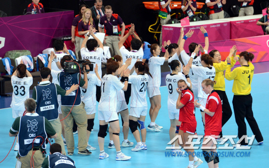 1일 오전 영국 런던 올림픽파크 코퍼 복스에서 열린 2012런던올림픽 여자 핸드볼 조별리그 3차전 노르웨이와의 경기에서 우리 핸드볼팀이 27대27로 극적인 무승부를 이루고 난 뒤 기뻐하고 있다 2012.8.1