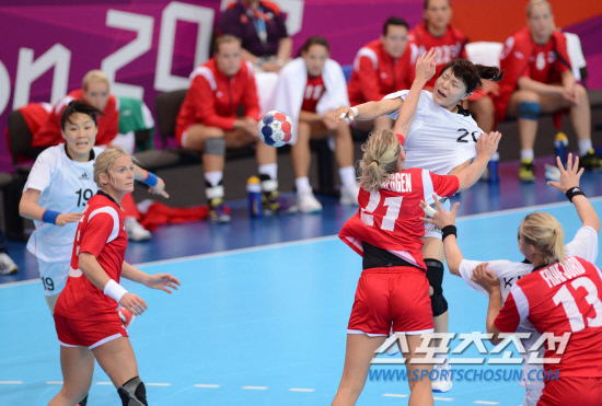 1일 오전 영국 런던 올림픽파크 코퍼 복스에서 열린 2012런던올림픽 여자 핸드볼 조별리그 3차전 노르웨이와의 경기에서 정지해가 슛을 쏘고 있다. 2012.8.1