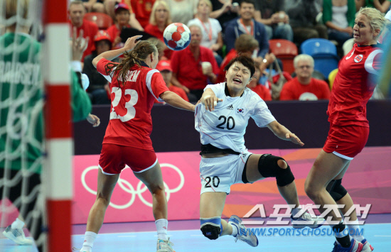 1일 오전 영국 런던 올림픽파크 코퍼 복스에서 열린 2012런던올림픽 여자 핸드볼 조별리그 3차전 노르웨이와의 경기에서 정지해가 슛을 쏘고 있다. 2012.8.1