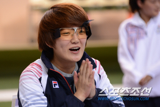 사격 25m 권총경기에 출전한 김장미 선수가 1일 왕립포병대 사격경기장에서 열린 결승경기에서 금메달을 땄다. 1위가 확정되자 김 선수가 환호하고 있다.