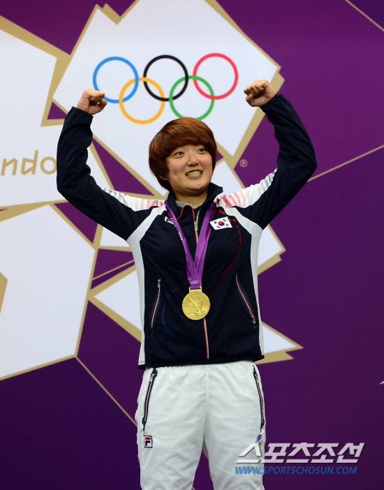 사격 25m권총에서 우승한 김장미가 1일(현지시간) 오후 왕립포병대 사격장에서 열린 시상식에서 두팔을 불끈 들어 익살스런 표정을 짓고 있다.20120801. 런던=올림픽사진기자단e