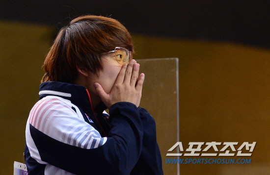 사격 25m권총에서 출전한 김장미가 1일(현지시간) 오후 왕립포병대 사격장에서 열린 결승에서 우승이 확정되자 감격스러운 듯 얼굴을 감싸고 있다.