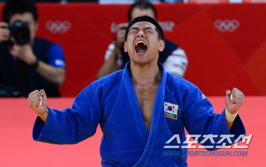 송대남(33, 남양주시청)이 1일 오후(현지시간) 영국 런던의 엑셀 아레나에 열린 2012 런던올림픽 유도 남자 90kg 이하급에서 금메달을 딴 후 환호하고 있다.