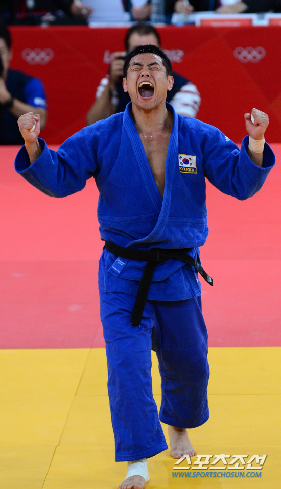 송대남(33, 남양주시청)이 1일 오후(현지시간) 영국 런던의 엑셀 아레나에 열린 2012 런던올림픽 유도 남자 90kg 이하급에서 금메달을 딴 후 환호하고 있다.