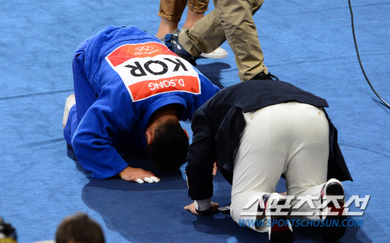 송대남(33, 남양주시청)이 1일 오후(현지시간) 영국 런던의 엑셀 아레나에 열린 2012 런던올림픽 유도 남자 90kg 이하급에서 금메달을 딴 후 정철 유도감독(오른쪽)에게 큰절을 하고 있다.