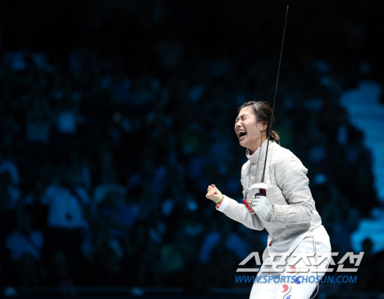 김지연이 1일 런던의 엑셀 사우스 아레나1에서 열린 2012런던올림픽 펜싱 여자 사브르 개인전 결승에서 세계랭킹 2위 소피아 벨리카야(27·러시아)를 15-9로 꺾고 금메달을 따고 환호하고있다.