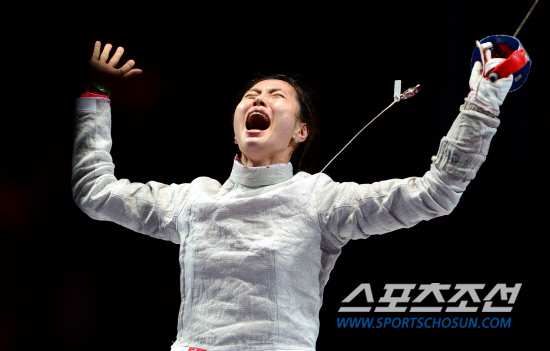김지연(24, 익산시청)이 한국 여자 최초로 펜싱 종목에서 올림픽 금메달을 획득했다. 김지연이 1일 저녁(현지시간) 영국 엑셀 런던 사우스 아레나에서 열린 여자 사브르 개인전 결승에서 러시아 베리가야 선수를 이긴 뒤 환호하고 있다.