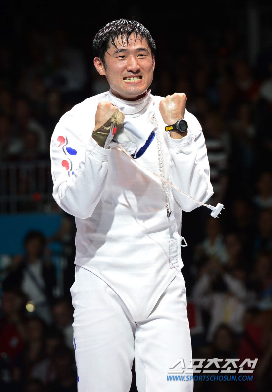 한국 펜싱 국가대표 정진선(왼쪽)이 1일 영국 엑셀 런던 사우스 아레나에서 열린 런던올림픽 남자 펜싱 에페 개인 3,4위전 웨스턴 켈시(미국)와의 경기에서 동메달을 확정 지은뒤 환호하고 있다. 20120801런던=올림픽사진공동취재단g