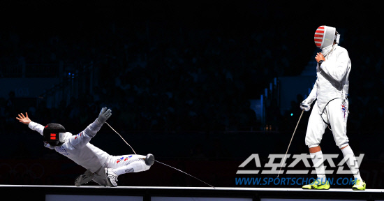 한국 펜싱 국가대표 정진선(왼쪽)이 1일 영국 엑셀 런던 사우스 아레나에서 열린 런던올림픽 남자 펜싱 에페 개인 3,4위전 웨스턴 켈시(미국)와의 경기에서 동메달을 확정 지은뒤 환호하고 있다. 20120801런던=올림픽사진공동취재단g