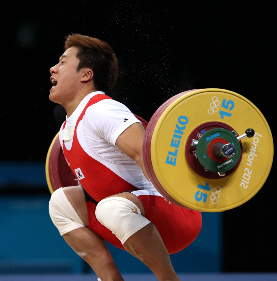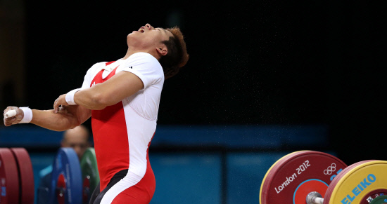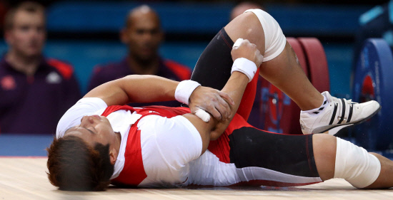 1일(현지시간) 영국 런던의 엑셀 아레나에서 열린 2012 런던올림픽 남자 역도 77㎏급에 출전한 사재혁이 인상 2차 시기에 162㎏을 시도하다가 팔을 다쳐 바닥에 쓰러지고 있다.