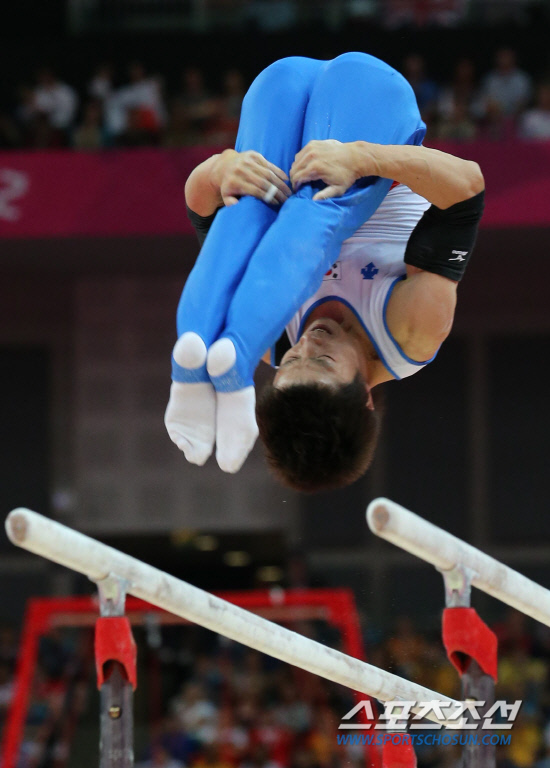 런던올림픽 남자 체조 개인종합에 출전한 한국의 김수면이 1일 오후 (현지시각) 런던 노스그리니치 아레나에서 열린 결선 경기에서 평행봉 연기를 하고 있다.