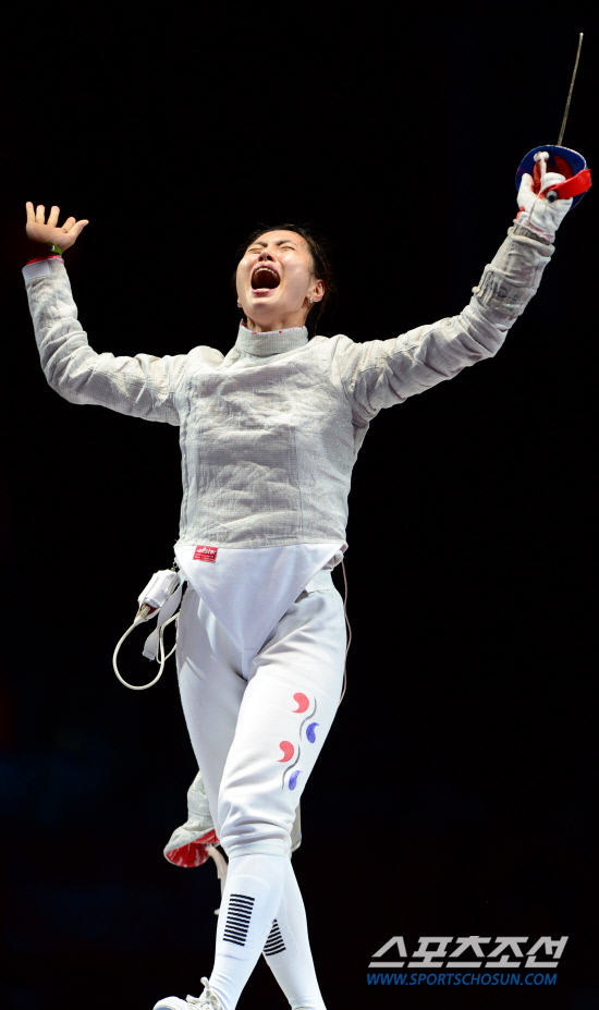김지연(24, 익산시청)이 한국 여자 최초로 펜싱 종목에서 올림픽 금메달을 획득했다. 김지연이 1일 저녁(현지시간) 영국 엑셀 런던 사우스 아레나에서 열린 여자 사브르 개인전 결승에서 러시아 베리가야 선수를 이긴 뒤 환호하고 있다.