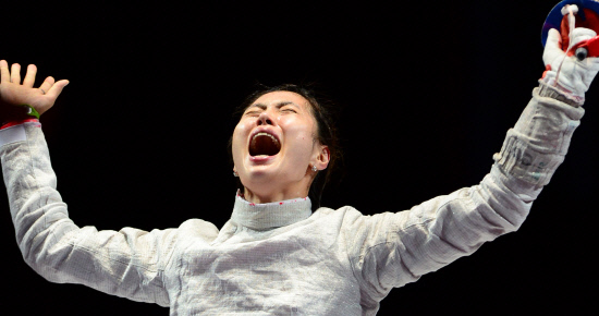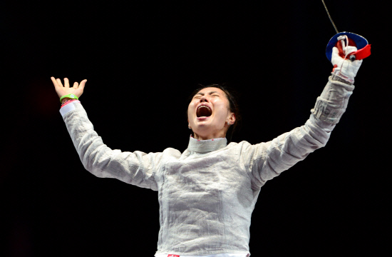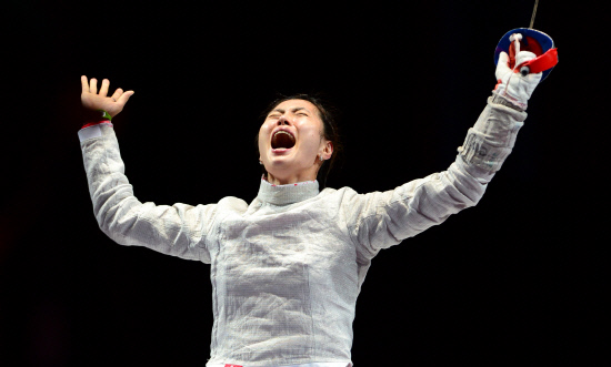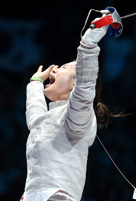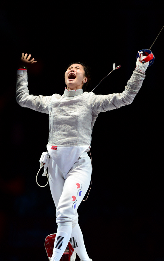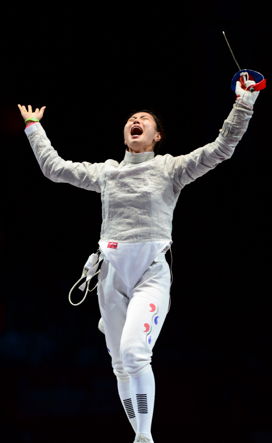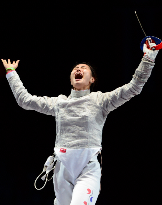 김지연(24, 익산시청)이 한국 여자 최초로 펜싱 종목에서 올림픽 금메달을 획득했다. 김지연이 1일 저녁(현지시간) 영국 엑셀 런던 사우스 아레나에서 열린 여자 사브르 개인전 결승에서 러시아 베리가야 선수를 이긴 뒤 환호하고 있다.