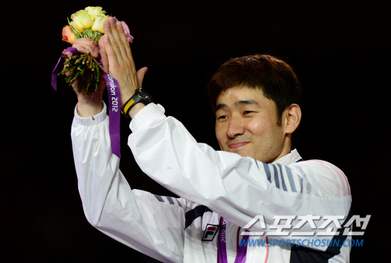 펜싱 남자 에페 개인전에서 동메달을 딴 정진선이 1일 저녁(현지시간) 영국 런던 엑셀 사우스 아레나에서 열린 2012 런던올림픽 남자 펜싱 에페 시상식에서 박수를 치고 있다.