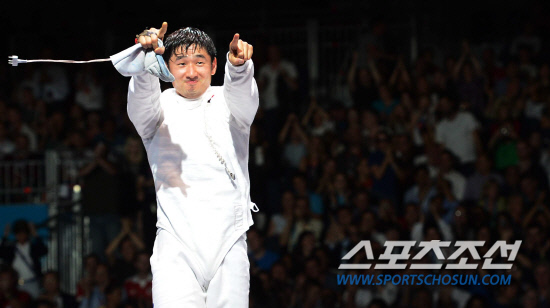 한국 펜싱 국가대표 정진선(왼쪽)이 1일 영국 엑셀 런던 사우스 아레나에서 열린 런던올림픽 남자 펜싱 에페 개인 3,4위전 웨스턴 켈시(미국)와의 경기에서 동메달을 확정 지은뒤 환호하고 있다. 20120801런던=올림픽사진공동취재단g