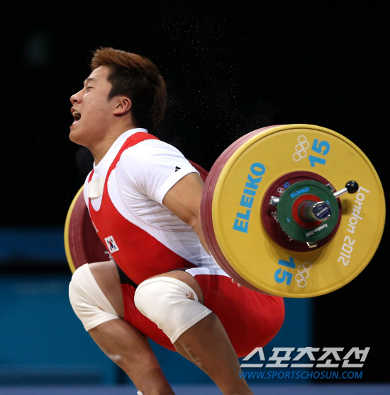 1일(현지시간) 영국 런던의 엑셀 아레나에서 열린 2012 런던올림픽 남자 역도 77㎏급에 출전한 사재혁이 인상 2차 시기에 162㎏을 시도하다가 팔을 다쳐 바닥에 쓰러져 있다.