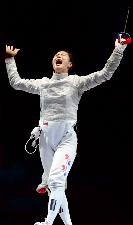 김지연(24, 익산시청)이 한국 여자 최초로 펜싱 종목에서 올림픽 금메달을 획득했다. 김지연이 1일 저녁(현지시간) 영국 엑셀 런던 사우스 아레나에서 열린 여자 사브르 개인전 결승에서 러시아 베리가야 선수를 이긴 뒤 환호하고 있다. 20120801런던=올림픽사진공동취재단f