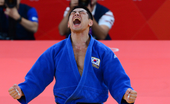 송대남(33, 남양주시청)이 1일 오후(현지시간) 영국 런던의 엑셀 아레나에 열린 2012 런던올림픽 유도 남자 90kg 이하급에서 금메달을 딴 후 환호하고 있다. 20120801런던=올림픽사진공동취재단f