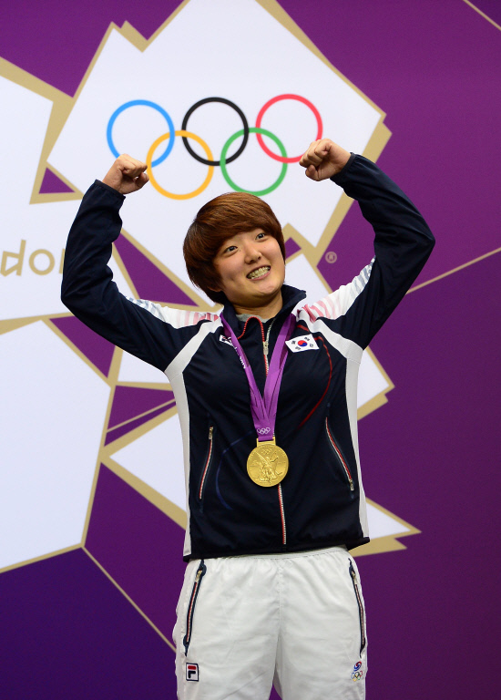 사격 25m권총에서 우승한 김장미가 1일(현지시간) 오후 왕립포병대 사격장에서 열린 시상식에서 두팔을 불끈 들어 익살스런 표정을 짓고 있다.20120801. 런던=올림픽사진기자단e