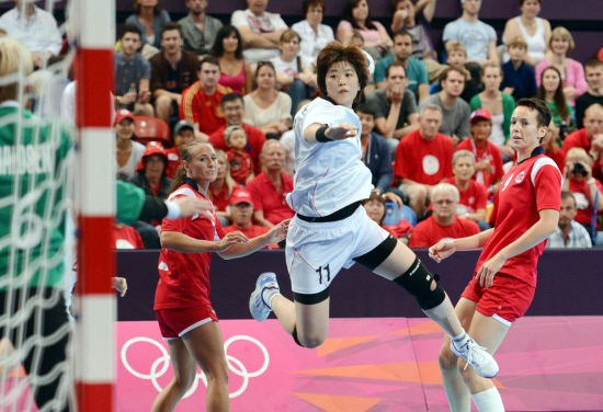 | ◇1일(한국시각) 영국 런던 코퍼박스에서 열린 노르웨이와의 2012년 런던올림픽 예선 B조 3차전에서 유은희(가운데)가 슈팅을 시도하고 있다. 런던=올림픽사진공동취재단 |