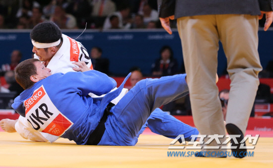 런던올림픽 남자 유도 100kg급에 출전한 한국의 황희태가 2일 오전 (현지시각) 런던 엑셀 노스 아레나에서 열린 16강전에서 우쿠라이나의 아르템 블로센코에게 뒤집기 한판승을 따내고 있다.