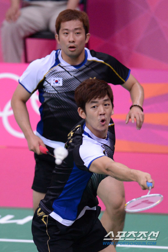 배드민턴 남자복식에 정재성과 같은 조로 출전한 이용대가 2일(현지시간) 웸블리 아레나에서 열린 인도네시아와의 경기에서 공격을 하고 있다.