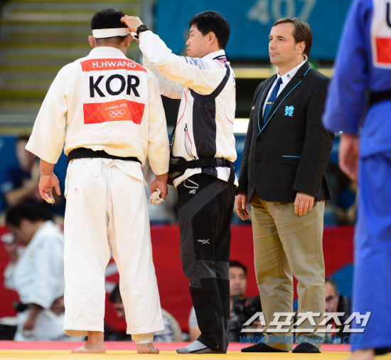 2102 런던올림픽 유도대표팀의 황희태가 2일 엑셀 런던의 노스 아레나에서 열린 남자 유도 100kg급 16강전에서 우크라이나의 아르템 블로센코를 상대하던 중 이마에 부상을 입어 치료받고 있다.
