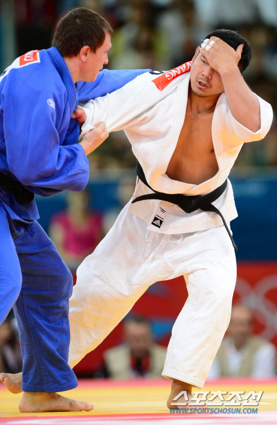 2102 런던올림픽 유도대표팀의 황희태가 2일 엑셀 런던의 노스 아레나에서 열린 남자 유도 100kg급 16강전에서 우크라이나의 아르템 블로센코를 상대하던 중 이마를 부딪쳐 흐르는 피를 막고 있다.