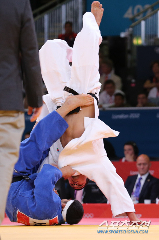 런던올림픽 남자 유도 100kg급에 출전한 한국의 이 2일 오전 (현지시각) 런던 엑셀 노스 아레나에서 열린 8강전에서 아제르바이잔의 엘마 가시모프를 공격하고 있다. 황희태는 유효승으로 준결승에 진출했다.