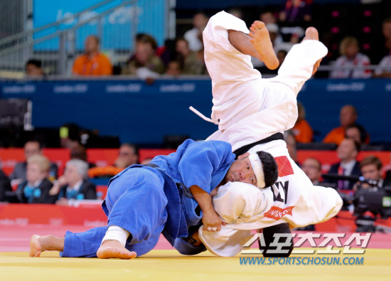 런던올림픽 남자 유도 100kg급에 출전한 한국의 황희태가 2일 오전 (현지시각) 런던 엑셀 노스 아레나에서 열린 8강전에서 아제르바이잔의 엘마 가시모프를 상대로 유효를 따내고 있다. 황희태는 준결승에 진출했다.