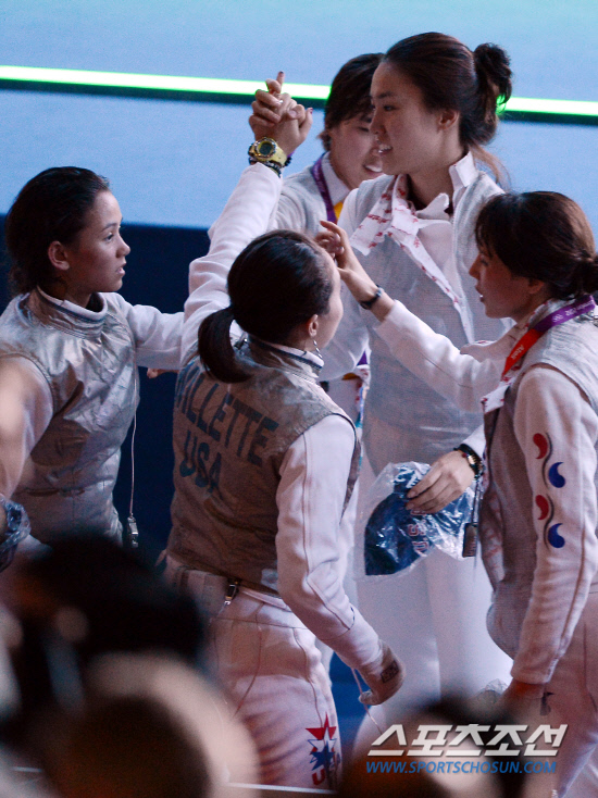 파이팅 다지는 한국 여자펜싱 2일 오전(현지시간) 런던 엑셀 사우스아레나 경기장에서 열린 펜싱 여자단체 플뢰러 8강전에서 한국 대표팀(남현희,전희숙,정길옥)이 미국에 45-31로 승리하며 준결승에 진출했다. 20120802런던=올림픽사진공동취재단L