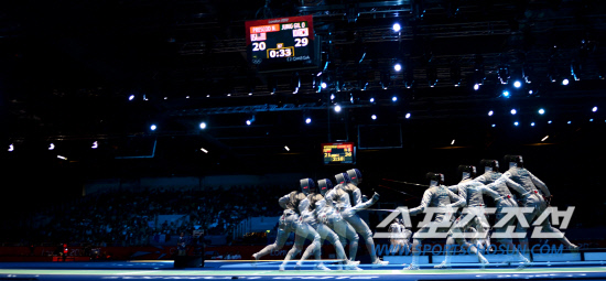 2일 런던 엑셀 사우스아레나 경기장에서 열린 펜싱 여자 단체 플뢰레 8강전에서 대표팀(남현희, 전희숙, 정길옥)이 미국에 45-31로 대승을 거두며 4강에 진출했다. 정길옥(오른쪽)이 미국의 프레스코드를 상대로 공격을 펼치고 있다.