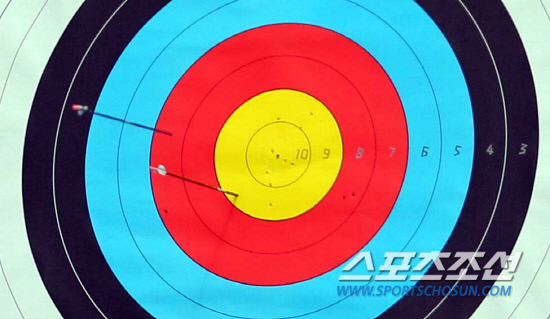 기보배(24·광주광역시청)가 2일(현지시간) 영국 런던의 로즈 크리켓 그라운드에서 열린 런던올림픽 양궁 여자 개인전 8강전에서 세냐 페로바(러시아)와 경기를 하고 있다.기보배의 화살이 날아가고 있다.
