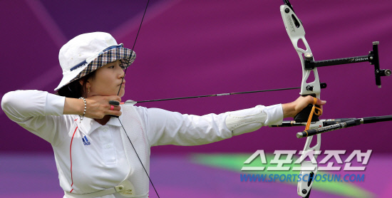 기보배(24·광주광역시청)가 2일(현지시간) 영국 런던의 로즈 크리켓 그라운드에서 열린 런던올림픽 양궁 여자 개인전 준결승전에서 승리한 후 기뻐하고 있다.