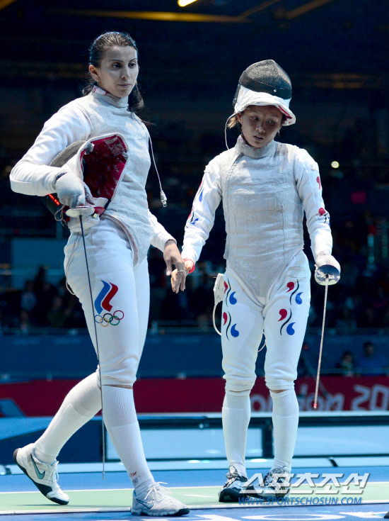 2일 런던 엑셀 사우스아레나 경기장에서 열린 펜싱 여자 단체 플뢰레 4강전에서 여자대표팀(남현희, 전희숙, 정길옥)이 러시아에 패하며 결승 진출이 좌절됐다. 마지막으로 경기를 펼친 남현희가 아쉬워하고 있다..