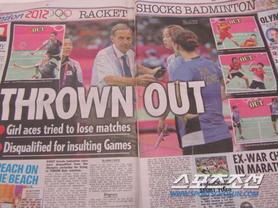 영국 대중일간지 더선은 '퇴출'이라는 제하에 여자에이스들이 일부러 져주기 시도, 올림픽을 모욕한 죄로 실격처리라는 제목을 뽑았다. 주심이 한국선수에게 블랙카드를 빼든 장면을 메인사진으로 썼다. 한국 중국 말레이시아 선수들의 이름을 일일이 거명하며 고의적인 경기 장면을 찍어올렸다. 선수들의 등 뒤에는 '코리아(KOREA)'라는 영문이 선명하다.