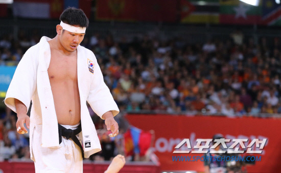 런던올림픽 남자 유도 100kg급에 출전한 한국의 황희태가 2일 오후 (현지시각) 런던 엑셀 노스 아레나에서 열린 준결승에서 몽골의 나이단에게 유효를 허용해 패한 뒤 경기장을 빠져나오고 있다.