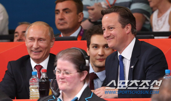 블라디미르 푸틴 러시아 대통령(왼쪽)과 데이비드 캐머런 영국 총리가 2일 오후(현지시각) 런던 엑셀 노스 아레나를 찾아 유도 경기를 관람하고 있다.