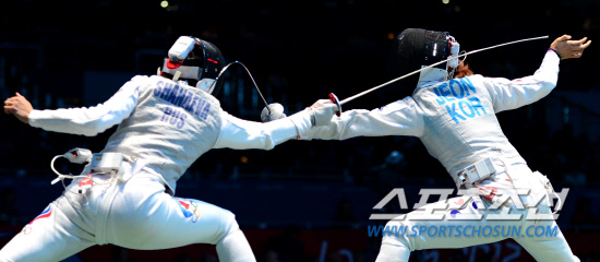 2일 런던 엑셀 사우스아레나 경기장에서 열린 펜싱 여자 단체 플뢰레 4강전에서 여자대표팀(남현희, 전희숙, 정길옥)이 러시아에 패하며 결승 진출이 좌절됐다. 전희숙(오른쪽)이 러시아 샤나에바와 경기를 펼치고 있다. 득점을 올리고 있는 전희숙.