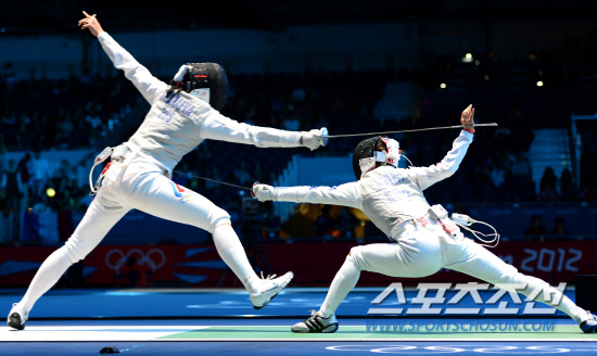 2일 런던 엑셀 사우스아레나 경기장에서 열린 펜싱 여자 단체 플뢰레 4강전에서 여자대표팀(남현희, 전희숙, 정길옥)이 러시아에 패하며 결승 진출이 좌절됐다. 남현희(오른쪽)가 러시아 샤나에바와 경기를 갖고 있다.