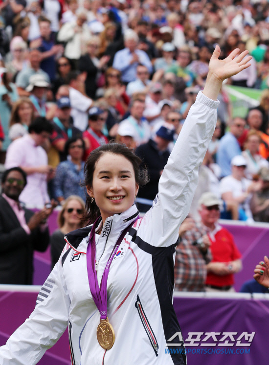 2일 오후(현지시간) 런던올림픽 양궁장 로즈 크리켓 그라운드에서 열린 양궁 여자 개인 결승전에서 슛오프까지 가는 접전끝에 아이다 로만(멕시코)을 꺽고 금메달을 차지한 기보배 선수(가운데)가 시상식을 마친뒤 환호에 답하고 있다. . 20120802 런던=올림픽사진공동취재단m
