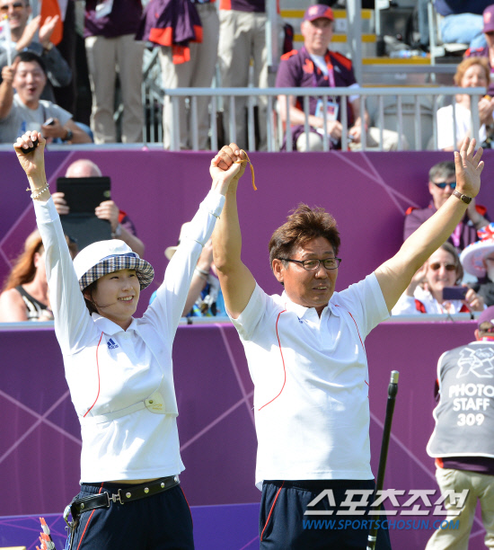 기보배선수가 여자양궁개인전에서 금메달을 획득한후 백웅기 감독과 기뻐하고있다