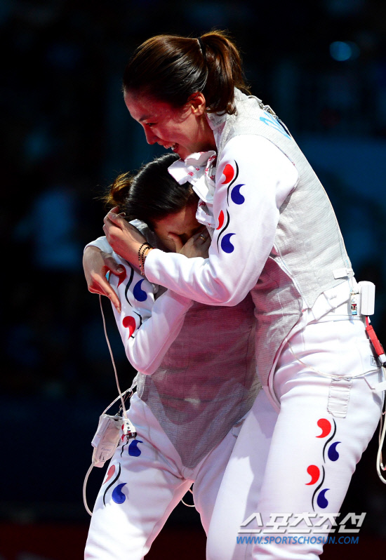 2일 런던 엑셀 사우스아레나 경기장에서 열린 펜싱 여자 단체 플러레 동메달 결정전에서 여자대표팀(남현희, 전희숙, 정길옥, 오하나)이 프랑스에 45-32로 승리하며 동메달을 획득했다. 동메달이 확정되자 남현희가 눈물을 보이고 있다. 오하나(오른쪽)가 포옹을 하며 다독이고 있다.
