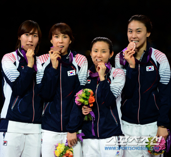 2일 런던 엑셀 사우스아레나 경기장에서 열린 펜싱 여자 단체 플러레에서 여자대표팀 전희숙, 정길옥, 남현희, 오하나(왼쪽부터)가 동메달을 획득했다. 시상식에서 밝은 표정으로 포즈를 취하고 있는 선수들.