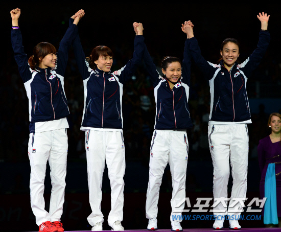 2일 런던 엑셀 사우스아레나 경기장에서 열린 펜싱 여자 단체 플러레에서 여자대표팀 전희숙, 정길옥, 남현희, 오하나(왼쪽부터)가 동메달을 획득했다. 시상식에서 밝은 표정으로 포즈를 취하고 있는 선수들.