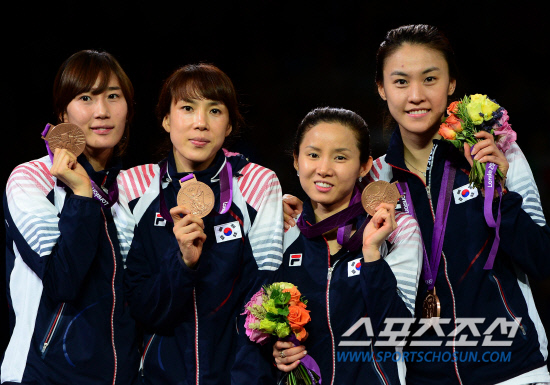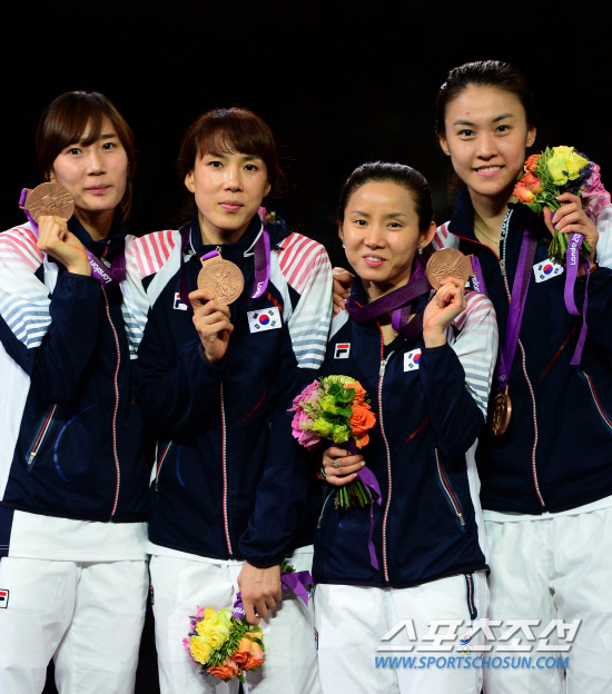 2일 런던 엑셀 사우스아레나 경기장에서 열린 펜싱 여자 단체 플러레에서 여자대표팀 전희숙, 정길옥, 남현희, 오하나(왼쪽부터)가 동메달을 획득했다. 시상식에서 밝은 표정으로 포즈를 취하고 있는 선수들.