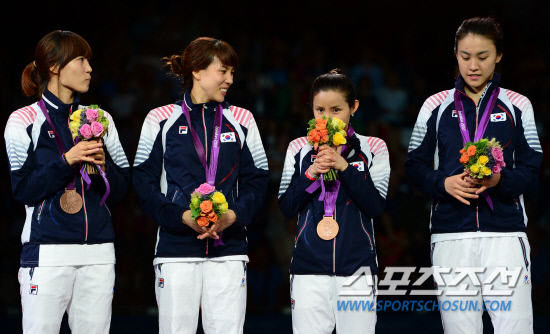 2일 런던 엑셀 사우스아레나 경기장에서 열린 펜싱 여자 단체 플러레에서 여자대표팀 전희숙, 정길옥, 남현희, 오하나(왼쪽부터)가 동메달을 획득했다. 시상식에서 밝은 표정으로 포즈를 취하고 있는 선수들.